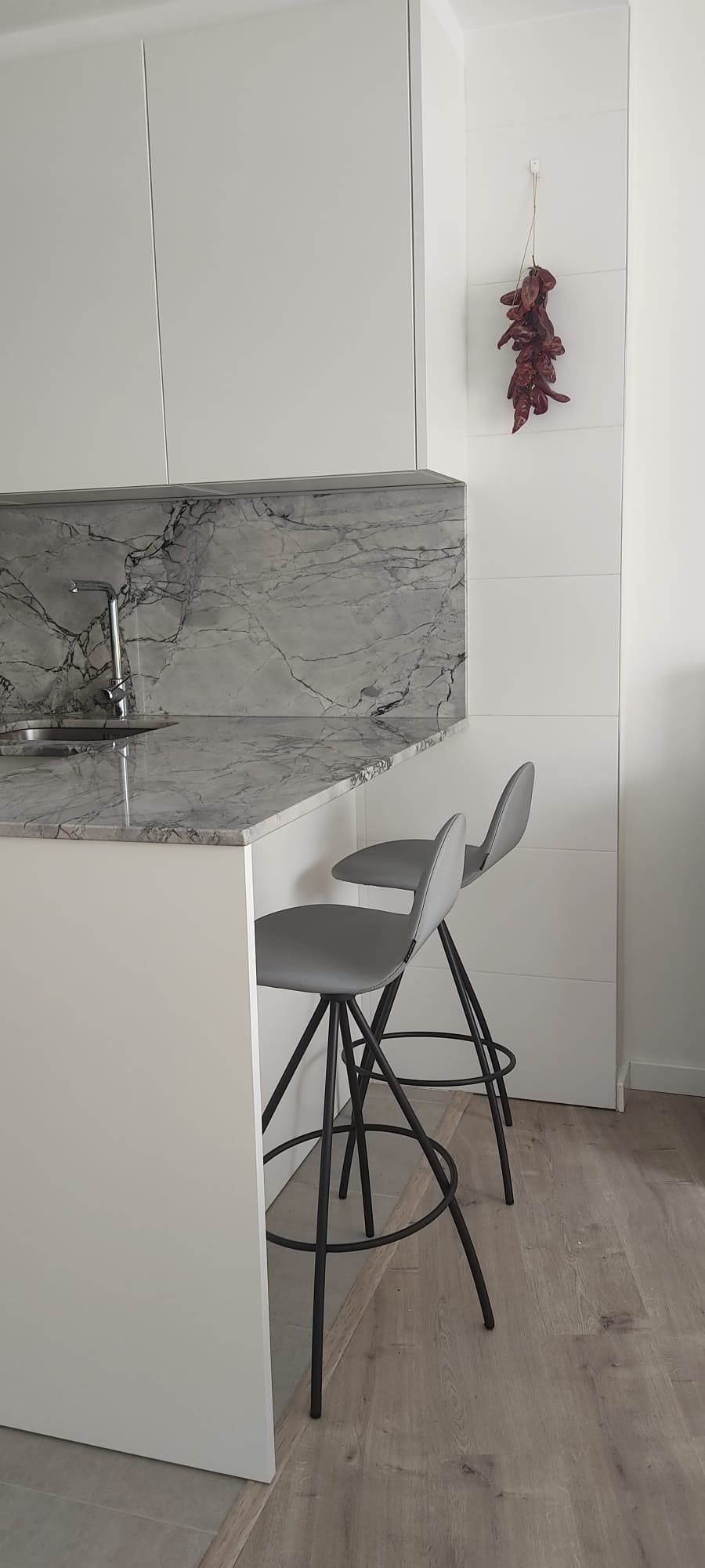 Sukaldeko altzariak eta enzimera porzelanikoa zurian jarri genituen. Kubo efektuaren atzealdea ere egur-efektu portzelanikoa da, biekin etxe atsegina lortuz.